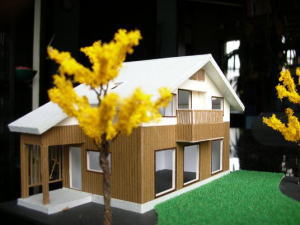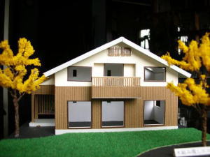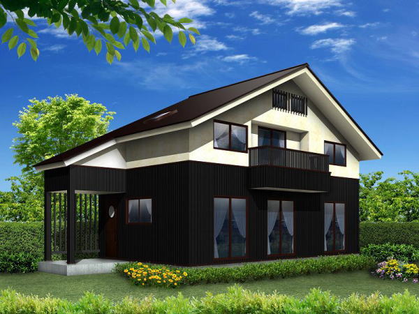 木造軸組み工法の木組み現しエコハウスです。内部は木組み(梁、柱など)をそのまま現して、珪藻土、無垢の床材、自然塗料などの採用により、昔ながらの家を表現します。大屋根の単純な架構方式を採用し、落ち着いた「和」のスタイルです。軒を深くしたデザインで、立て格子がバランスよく配置され、それ以外余分な装飾はありません。 |