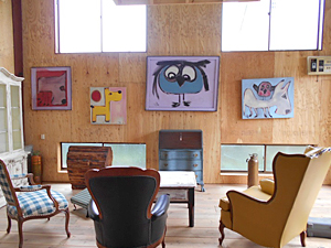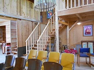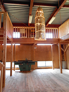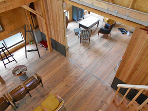 2階ギャラリーから見下ろし床は杉の足場板、引き分け戸も杉板で制作大きさの割にハンガーで吊っていますので、スムース