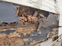 バルコニー手摺部分、雨水の侵入による木材のダメージ (この部分はすべてやりかえ工事)