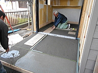 玄関とポーチの、タイル下地モルタル工事、間取りの変更に伴い、段差を低く抑えています