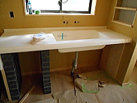 コーリアンカウンターを煉瓦で支える造作キッチン