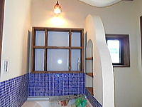 パウダールームも、壁・天井の珪藻土とモザイクガラスタイルで仕上げています ウェーブの壁に穴をあけ、収納棚を作成