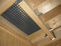 平面的には、5メートル×11.4メートルのシンプルな長方形です。妻方向の耐力壁を構成する間柱は2×4、桁行き方向が2×8の間柱で、一部を除いて石膏ボードは張らず、この2×8の間柱をそのままにして、すなわち構造材のままスッピンにして仕上げとしています。普通は目に見えるところに無垢の木を張ったりしていい感じに仕上げるのですが、どこかのコマーシャルにあったように「何もたさない、何もひかない」の感覚です。そのまんま東、いや違った、そのまんま見たし ・・・・であります。