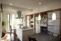 ★ 2重屋根通気遮断熱工法 ★ 温水循環方式床暖房設備 ★ 現場発泡断熱材、無垢の建材 ★ ミセスの動線を料理、子育て、収納、洗濯などの
