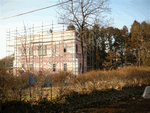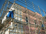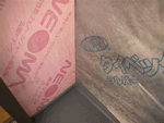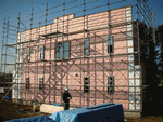外断熱に使われるネオマフォームの施工。タイベック(一部タイベックシルバー)、ネオマフォーム、通気胴縁、ガルスパン(アイジー工業)の順で工事が進む。