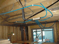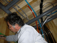 電気工事の担当者と、オーディオルーム(防音仕様)の壁面につける換気扇の位置の打合せ。換気扇は大建工業の24時間換気システムの「エアスマート」を採用しています。換気扇をつけるこの面は、天井まで造作の本棚とデスクが計画されています。オーディオルームの上には水周りが配置されているため、天井の懐には、電気配線のほかに給水管や配水管がところ狭しと施工されています。