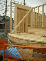 この「SGA」計画では、基礎工事に続き木工事も難易度の高い工事になります。ソフトにおいては、珪藻土や無垢のフローリングなど自然素材を使い、「ヒンズースタイル」を内部そして外部に表現するのですが、ハードにおいては、熟練の大工でも「ウーン」とうならせる場面がいたるところに現れてきます。ハードとはいわゆる技術的な問題解決のことです。建方工事に限って順を追ってみていきますと、まず第1番目に、半地下があります。ということは、1階から昇る階段と降りる階段が2つ出てくることになります。降りた半地下は壁が2階の床まで続く、天井高3.3メートルを超える音楽室と天井高1.3メートルの蔵の2室で構成されます。蔵の上は半円を描いたアーユルヴェータ・マッサージルームです。その上のバルコニーも同じ半円で仕上げます。半円を作る施工、これが第2番目です。