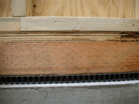 第3番目は、2階に浴室を持ってきている関係上、床ダウンの施工です。隣のパウダールームと床段差のないバリアフリーにするため、浴室部分の床は構造補強の上、2階の床から285ミリ下げています。金物でユニットバスを支持せず、すなわち、釘のせん断力に期待しないで、床面全体で支持する方法で施工することにしています。