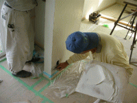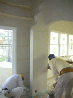 珪藻土こて塗り 2階のリビング、ダイニング、キッチン、パントリー、トイレの壁は全て珪藻土のコテ仕上としています。手作りキッチンの部分も同じです。「ザ・ホワイトプロバンス」を表現するのにふさわしい素材として選択しました。施工手順は、まず石膏ボードのジョイント部に幅50ミリの「J・ファイバーテープ」を貼ります。下地の石膏ボードの経年変化による、ねじれ、ゆがみ等に仕上材がある程度追随するためのものです。コーナー部分も同様の施工とします。その上から「スーパーカーボンプラスター」を詰めます。これで継ぎ目部分がほぼ平らになります。次に下地調整材として、「スーパーカーボンプラスター」を下地全面に中塗りします。乾燥させてから、最後に上塗り材の「けいそうモダンコート内装シルキー」でこて塗り仕上げとします。薄くもなく、厚くもならないように時間をかけて、南仏の山間の田舎のイメージを転写しています。 2006.10.17 |