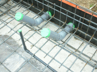 上から3番目の写真では、排水管が基礎ベース下端の主筋D13を切断しないで施工していることがわかる。主筋を切断して排水勾配をとる会社もあるようだが、主筋である為、切断しない方が望ましい。