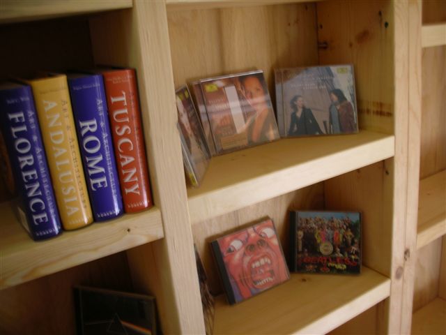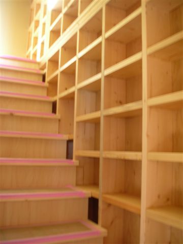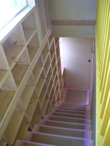 「208・外断熱の家」の階段部分の壁厚(184mm)を利用して作った棚板。外断熱、すなわち構造躯体の外側に断熱材を設けているため、構造躯体の中の構成は自由である。厚さ89oの204の場合、壁倍率は3倍である。今回は184oの208を使用しているが、同じく壁倍率を安全側にみて3倍としている。同じ壁量で、単純に2倍強の材積(木材の体積)があるわけになる。妻方向の耐力壁は204、桁行方向のみ耐力壁を208としている。妻方向の内部耐力壁は両側共石膏ボードを張って、いたるところに出てくる電気配線をうまく隠す工夫をしている。2階床梁に取り付ける照明も、ライティングレールで配線を隠している。さて、自由に構成される桁行方向の収納形式を見てみよう。
