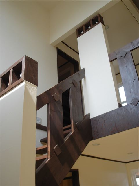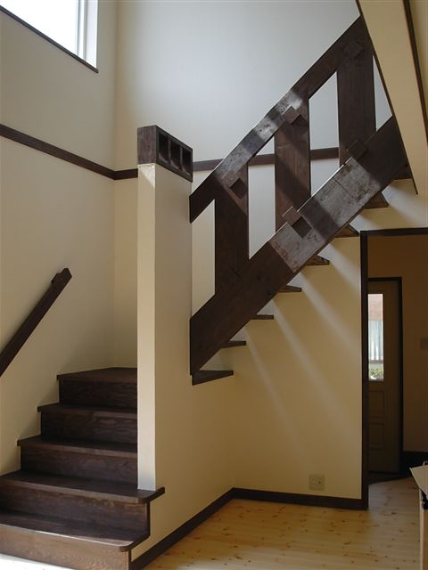 カントリーハウスの階段デザイン。ダイニングテーブルの他、その上の照明デザインも構造材をそのまま使い、現場で組み立てています。入居4年目に入り、ますます手作り感の雰囲気が増しています。15年後はもっと味わいを増していることと想像されます。天然木の擦れた傷や飴色に変色したパインの床が、しっとりと空間と呼吸しながら馴染んでいる。アジアンデザインやカントリーデザインは、やはり年月がある程度経過した方がいい。多少の荒っぽさがないと工業化住宅と変わりなくなってしまう。