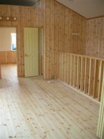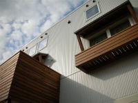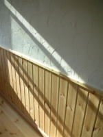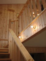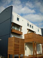 「天然木に包まれた癒しの内部空間」・・・を実現させるために、平面的な空間構成もさることながら、建築素材の選定に充分な調査および検討に時間が費やされた夫婦二人と愛猫のための超快適住宅です。構造は当初から、気密、断熱、耐震の観点から枠組壁工法で決まっています。断熱材として採用しているアップルゲートセルロース断熱材は、原料がパルプで木の繊維であるセルロースには湿気を吸放出する性質があり、加えて防カビ・防虫の効果にホウ酸が添加されているすぐれものです。断熱材の工事には1週間費やしています。(通常は1日か2日で終ります)土台の防腐、防蟻には、リボス社のアンドラを、そして塗装に使われる塗料については、内部の階段、ドア、枠、カウンター及び外部のブラジル産イペやウェスタンレッドシダ−で統一感あるデザインで構成されたデッキやプランターボックス、バルコニーには同じくドイツのオスモカラーを指定しています。床は全て無垢のスウェーデンパインフローリングで、壁は珪藻土と、板張りのところはやはり無垢のスウェーデンパインで、生成りの「白」とナチュラルな「天然木」でコントラストを出しています。化学合成された建材、すなわち合板フローリングや塩ビシートの建具や巾木を極力排除したのも「癒しの内部空間」を表現するためには自然の選択でした。階段材も集成材でなく無垢の構造材を加工してそのまま使用しています。角は全てR加工させています。大工からすれば、集成材の段板をチョコッと取り付けてしまえば楽なのでしょうが、ここでは少し骨を折ってもらいました。 |
