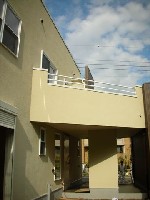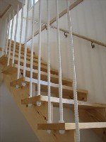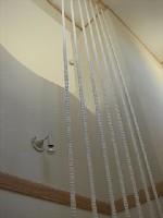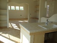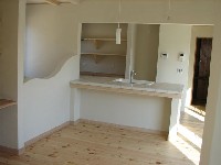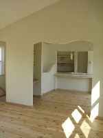 太さ19ミリの鉄筋で吊られた階段を上ると、生活の中心である2階です。白い誘惑という言葉がぴったりな空間です。地中海の波のイメージである「ウェーブ」がところどころに現れてきます。「ウェーブ」ですからクロスなんて貼れませんし似合いません。壁は全て珪藻土のコテ仕上げです。クロスの3倍くらいのコストがかかります。効果、効用そして手間を考えれば当然のコストといえます。下地から仕上げまで時間をかけて丁寧に施工してもらいましたが、一部僕が気に入らないところがありましたので、気に入るまで何度もコテで押えてもらいました。押えすぎてはみ出したところは、削ってまた滑らかにするという感じです。ご苦労様でした。そうこうして、南仏の山間の素朴な小さな家のような仕上がりとなりました。小さいといってもここのリヴィングとダイニングをあわせると、ちょうど20帖で充分な広さです。その部分は3寸の屋根に沿って勾配天井としているため実際よりさらに広く感じます。1階に広い納戸を設けているためロフトは作らずここでは勾配天井を最優先しました。