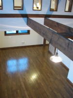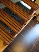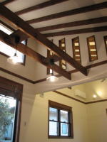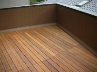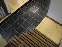 階段を上がって障子を開けると、路地空間とは一味違った「和モダン」の世界が現れます。新築とはいえない古めかしさ、遠い昔からここにいるような感じ、東海道五十三次に出てくる茶屋で、とっておきの静岡産の熱いお茶をすすり、これまたとっておきの草加せんべいをかじっている雰囲気が似合いそうな素朴な空間です。縁側をあきらめたとしましたが、この素朴な空間から広いバルコニーが連続しています。ロンプルーフシート防水(FRP防水より高性能)を施したバルコニーの床には仕上材としてブラジル産イペをフローリングのように施工し縁側のイメージを醸し出しています。朝日は何にも遮られないで、さんさんとこの素朴な空間に、そして隣のキッチンに溢れこんできます。冬の低い日差しですと、ダイニング横の小上がり和室まで届きそうな勢いです。なお、勾配天井とロフト部分の高窓は掃除が大変ですので、工事中にあらかじめ光触媒をコートしてメンテナンスを不要としています。さて、キッチンに移るとそこは機能最優先で設計しています。L型キッチン、ミセスカウンター、パントリー、本棚付パソコンカウンターがミセスの動線に従って配置され小上がり和室へと続きます。すなわちキッチンが行き止まりでなく、ぐるぐる回れる楽しいプランニングになっています。床材は普通ならヒノキあたりをもってくるのでしょうが、あえてUSAオークフローリングを採用しています。この普通ならの「普通」が物事をつまらなくさせている原因であると考えますので、けして伝統を否定しているわけでなく、伝統はさしあたって「保管」していると思ってください。パウダールームの平面計画と合わせ「普通」としなかったことが、固有の和風から少し離陸したような感じです。まるで自分が始祖鳥になった気分です。付け加えるとこの住宅は外観からは「和」を楽しむ家であるとはまったく気が付かないようにデザインしています。「和」の素材は一切外に出していません。「都市住宅」の表層の中に「和モダン」の世界を包み込んでいるのです。意味論的にはダブルコードの家といえましょう。