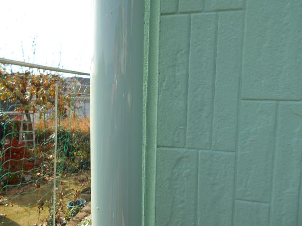 右側の窯業系サイディング部分は屋根と共に「ガイナ」で塗装、左の塩ビの樋はガイナの色に合わせウレタンで再塗装しました。