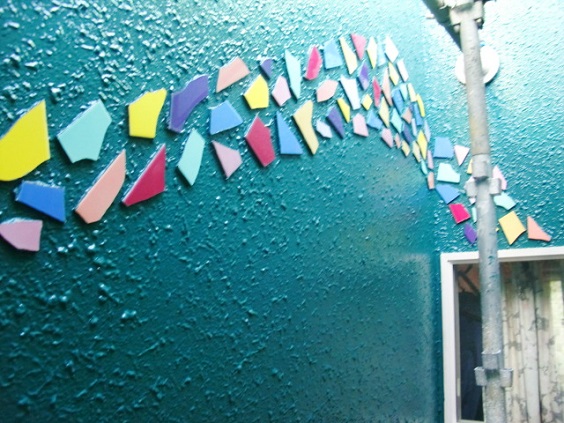 当社設計の 「ドレミの家」 (守谷市) 中庭のクラッシュタイルです。 外壁塗替で、竣工当時のビシッとした色合いが戻りました。