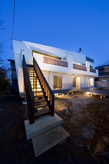シルバーメタリックの外壁と、こげ茶で塗られた無垢材のコントラスト。