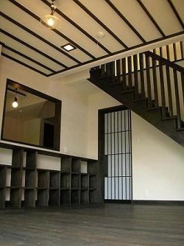 心象風景としての昭和を目指した「黒塗りの渋い民家」のオープンハウスです。家族団欒・板の間・適度な暗さ・黒を基調とした渋い色彩空間・丸いちゃぶ台・風通し・障子を通して差し込まれるほのかな光など谷崎潤一郎の「陰翳礼賛(いんえいらいさん)」の世界をお楽しみいただけます。