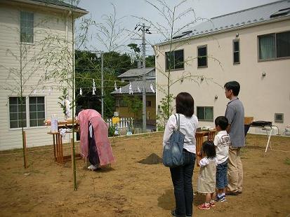 午前中からパラパラと雨が降り出して、午後の地鎮祭は雨の中かな・・・・と思っていましたが、見事に晴れました。ご家族とその祭事を照らすかのごとく、にっこり笑った太陽が雲間から顔を出し、燦々と輝き始めました。