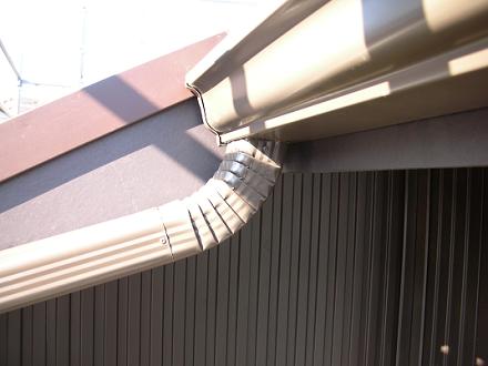 取り付けが終わったアルミ製雨樋 雨樋の素材はアルミです。光って外壁のガルバリュームと違った色に見えますが、ほぼ同系の色です。これは現場で加工・製作するもので、既製品ではありません。軒樋、立樋共に一般的な塩ビの雨樋に比べて断面積が大きいため、立樋の本数を少なくすることができます。