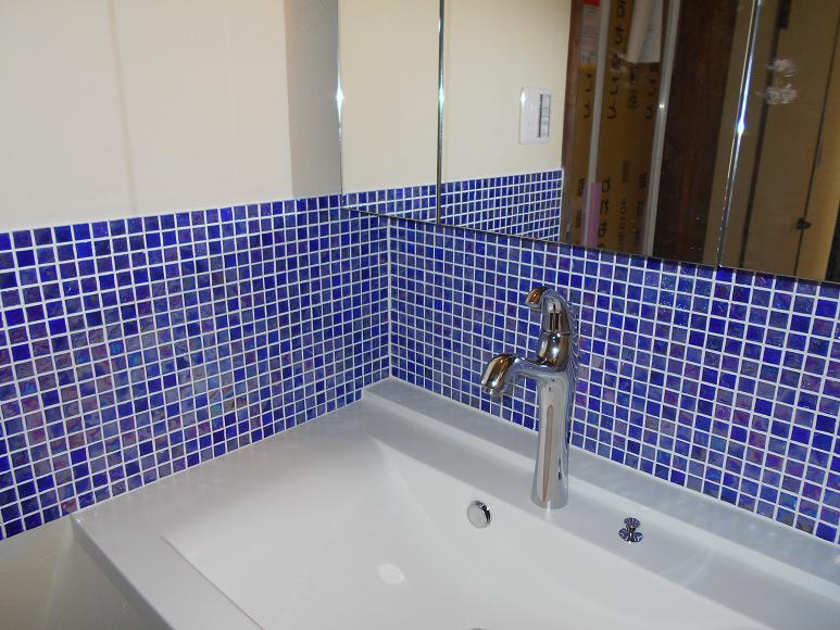 このタイル、サンプルを取り寄せたときには角が何箇所も割れていました。 タイルといっても素材はガラスなので衝撃には弱そうです。タイル屋さんには特別に神経を使ってもらい、割れや欠けが無くきちんと施工してもらいました。