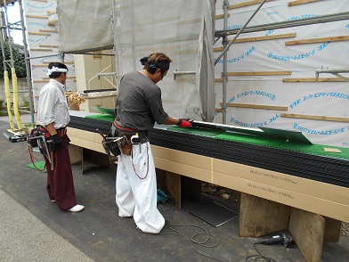 一本ものなら簡単そうに見えますが、これがオットドッコイ、一人ではできません。足場が邪魔になりますが傷をつけないように、二人または3人で、長尺もののガルバリュームをうまく滑り込ませます。