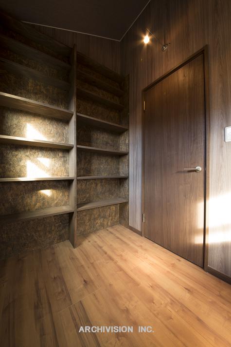 男の隠れ家としてのタタミ3帖ほどのスペースは、よりダークな色彩で構成。
