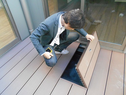 劣化しにくい樹脂デッキのふたの点検です。 メンテナンスの時に潜れるようにしました。