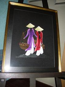 写真の額装しているものは刺繍で丁寧に織り込んだもので、昨年ルアンパパーンに行ったとき、ハノイで買ったものです。なぜハノイなのかといいますと、ベトナム航空のトラブルでトランジットのはずがハノイで一泊になってしまい、混沌とした旧市街を歩いていて見つけたものです。日本円にして700円くらいだったと思います。もちろん額代のほうが高いです。それにしてもアオザイはいいですね。