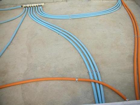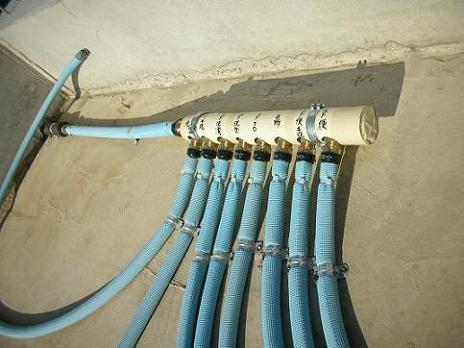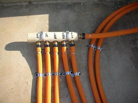 ヘッダー方式の採用により、将来万一不具合が出た場合でもメンテナンスが容易な施工方法です。ブルーが給水、オレンジが給湯です。