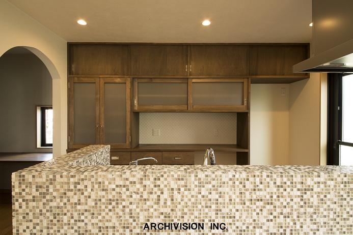 キッチンカウンター前に立ち上げたモザイクタイルと、造作バックカウンターのコントラスト。