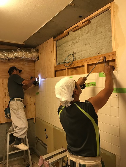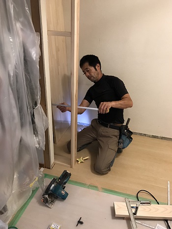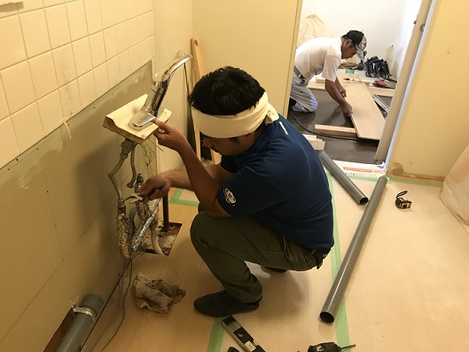 キッチンの交換では、木工事と設備の取り合いなどをチェックしながら進めています。