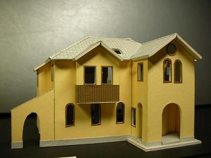 白模型は既に作っていますが、スタッフの作成した着色模型です。 設計のテーマの一部である ● 英国の田園風景に立つイメージの、重厚な外観デザイン ● 環境負荷を念頭に入れた省エネ住宅 ● レッドシダー、塗り壁、無垢の床などで構成されるインテリア素材 ● アルゴンガス入り、LОWーeガラスのアルミクラッドペアガラスの採用 ● アイランドスタイルのオープンキッチン「カナダ・メリットキッチン」 ● いつまで経っても飽きないトラディショナルスタイル ● 施主支給の建材コストダウン など実施設計に反映しながらまとめの段階に入っています。