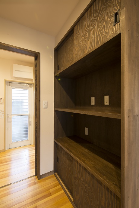 奥がパウダールームで通風勝手口ドア、分電盤を新設しています。
