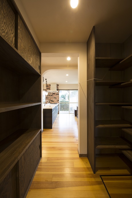 作業性の良さと収納力、パウダールームへの一直線の動線など、既存部分のプランを大幅に変更した部分です。