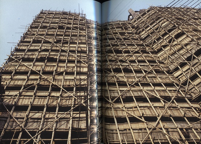 その中の驚きの一枚。 上海の工事現場での様子。なんと12階くらいはあると思われるビルの仮設足場を 「竹」 で組み上げています。 竹の筋違は入っているけど、日本では考えられないシーン。