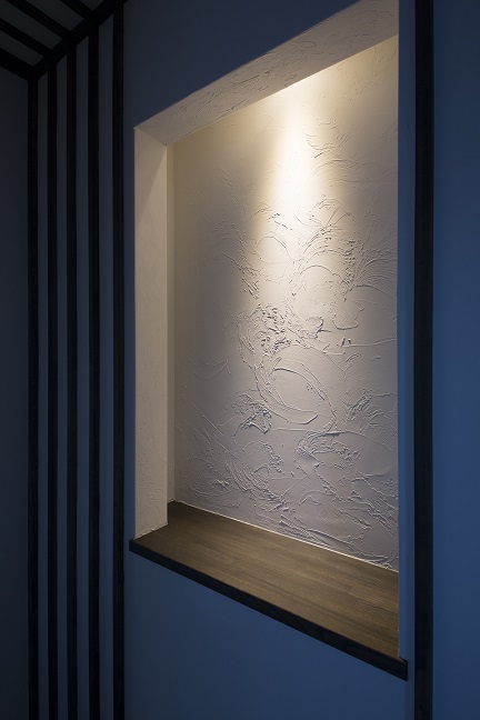 玄関にあるチョットした窪みの塗り壁。職人さんが珪藻土をコテで仕上げています。