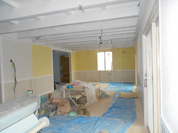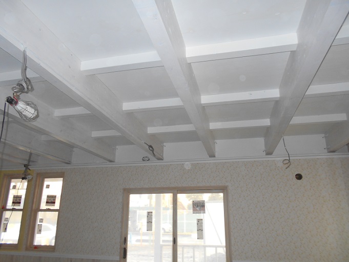 天井の方は構造材も 「白」 で塗装され、クロスとは違う木組み表しの、手の込んだ仕上げになっています。