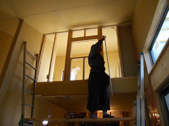「ご両親のためのコートハウス」 今日は現場打ち合わせでした。 大工さん、吹抜け部分の工事を行っています。 いつもご苦労様です。