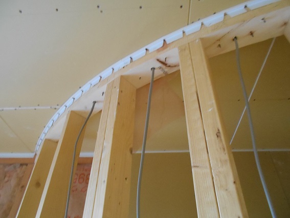 R部分の壁、天井の納まりです。 シンプルに見せるため、塩ビの廻縁を施工した上で曲線ボードを差し込みます。