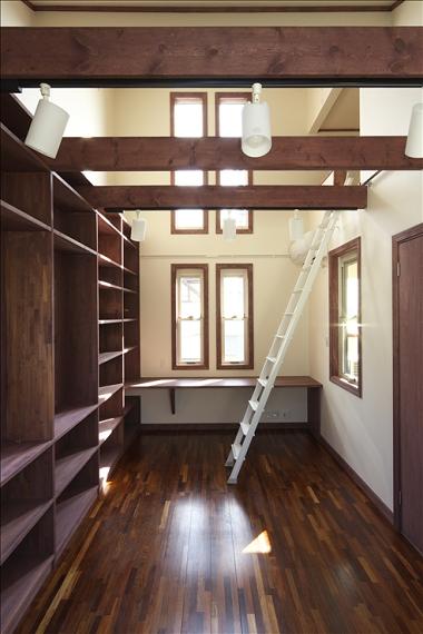 小豆色の色彩で統一した「高気密・高断熱の家」(2009年2月完成)の2階北側にあるオーナーの書斎です。 理知的な雰囲気を醸し出すように、空間の高さ、色合い、適度な採光、細部の寸法などを決めていきました。一方現実的な収納量としてはこれだけでは足りませんので、右奥上部の7帖のロフトが活用されます。オーナー様が既に使っている本棚などは、ロフトで再活用されます。 左側本棚の一番下の棚板は取り外しができるようになっており、そこには正面のパソコンカウンターからの配線が隠されており、機器類の配線が部屋の中に現れないようになっています。取り外しできますから、配線の変更やメンテナンスにも対応しています。撮影のスタンディングポイントあたりには大型スクリーンなども配置され、とかく配線だらけになってしまいますので、隠す工夫にこの本棚は貢献しています。