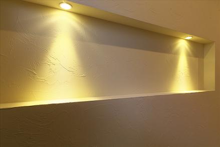 ニッチェに埋め込んだLEDランプの照らし具合です。 長いスカートをはいた女性のよう? に見えなくもありませんね。 ビアズレイの描く女性のようかな? と、想像が膨らんでしまいます。