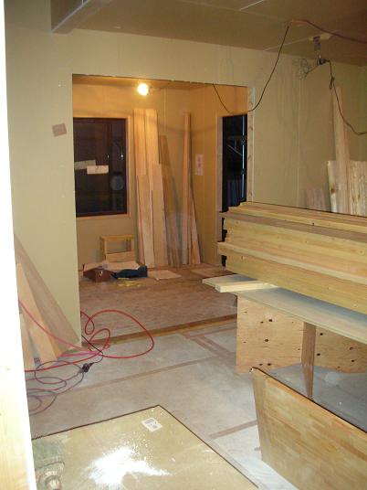 壁、天井の石コウボード張り、無垢フローリング張りが終わり、これからカウンター、造作キャビネット、巾木、壁のパイン板張りなど、無垢材や集成材を使う部分の施工に入ります。