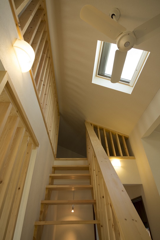 スカイライト、吹抜け、格子手すり、けこみ板なしなど、光を通過させる要素を取り入れて、十分な明るさを確保しています。