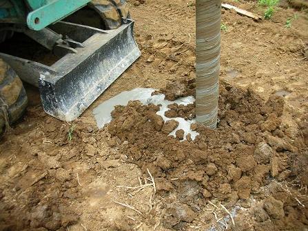 「TT」計画。昨日柱状改良工事が終わりました。 もともと地山の土地のため地盤そのものは悪くありません。 しかし、GL―6メートルの地点に水位が見られたことと、造成によるためか、 GLー1.5メートル付近がやや軟弱であったため、長さ4メートルの改良くいを40本打っています。