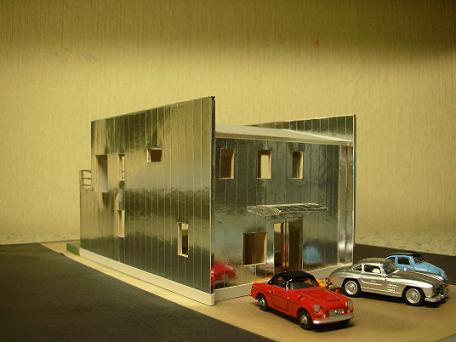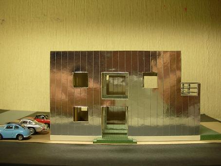 模型では外壁に合わせて銀色の折り紙を貼っています。けっこうピカピカ光るところがいいとおっしゃってくださいました。実際の建物は外壁をシルバーのガルバリュームにしていますが、模型ほどピカピカしてなく青空とよく調和しています。