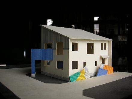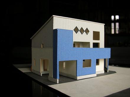 シンプルモダンをベースに、変形L型のバルコニーが2階のメインフロアーを囲む「スタジオ感覚の家」の模型です。形態バランス的にも水平ラインが強調されています。