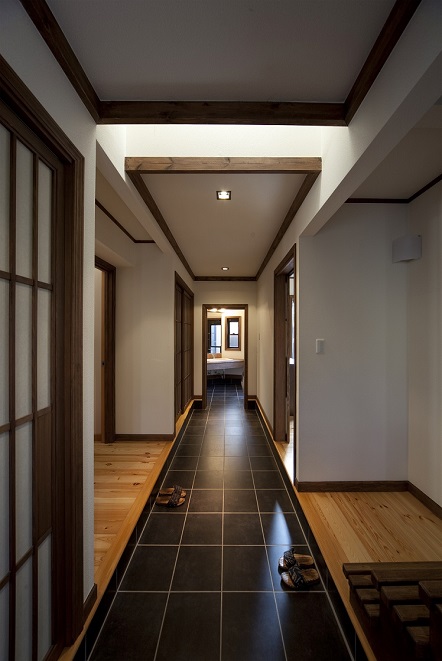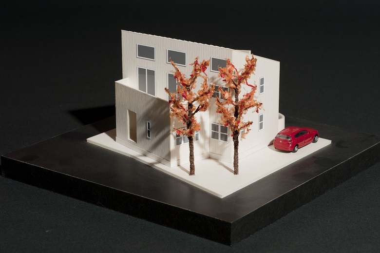 小屋裏利用の2階建て住宅、シンプルな切妻屋根が特徴です。