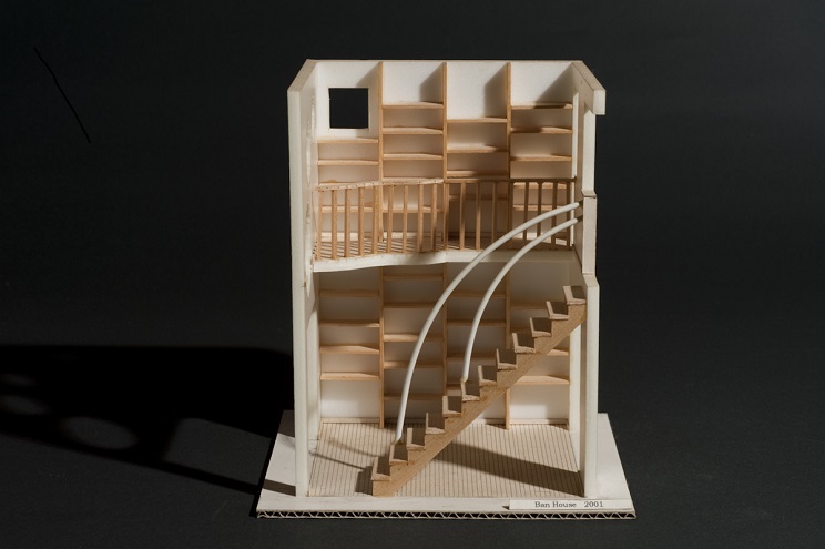 このリビング吹抜けに設けた造作本棚の様子を、スケール30の内観模型で表現。